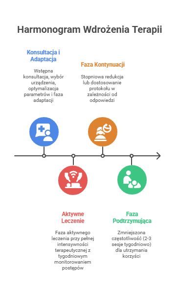 - Tydzień 3-6: Faza aktywnego leczenia przy pełnej intensywności terapeutycznej z tygodniowym monitorowaniem postępów
