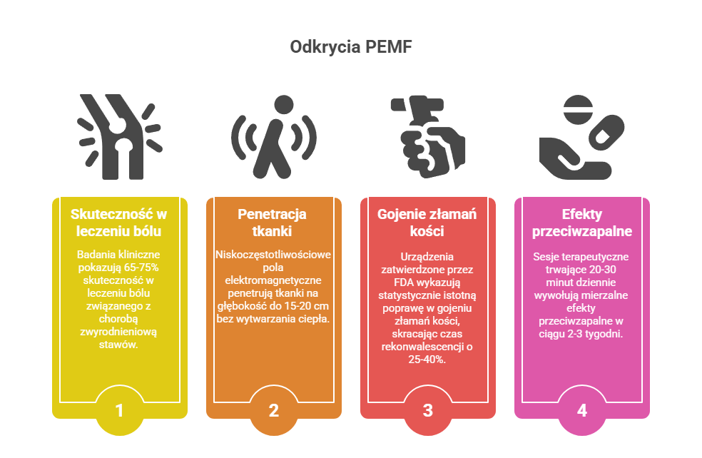 Zakres częstotliwości ma znaczące znaczenie. Pola o częstotliwości 1-10 Hz wpływają głównie na funkcję układu nerwowego i przekazywanie sygnałów bólowych, podczas gdy częstotliwości 10-50 Hz celują w gojenie układu mięśniowo-szkieletowego i redukcję stanów zapalnych. Częstotliwości 50-100 Hz wykazują najsilniejsze efekty w regeneracji tkanki kostnej i metabolizmie chrząstki.