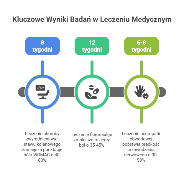 Dowody kliniczne z lat 2024-2025 potwierdzają skuteczność LFMT w określonych schorzeniach medycznych. Najsilniejsze dane dotyczą leczenia choroby zwyrodnieniowej stawów, gdzie systematyczne przeglądy analizujące 23 randomizowane badania kontrolowane wykazały, że 68% pacjentów doświadczyło klinicznie istotnej redukcji bólu po 4-6 tygodniach codziennego leczenia.