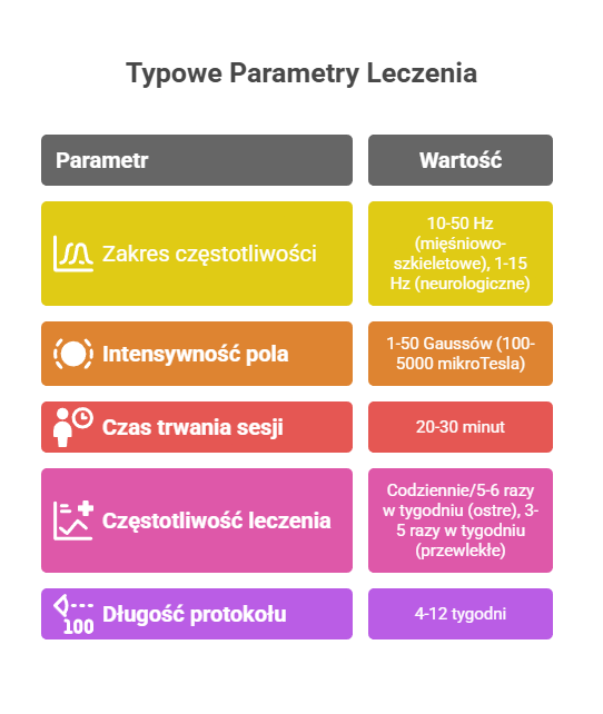 Według badań Instytutu im. Roberta Beckera opublikowanych w 2024 roku, parametry leczenia mają ogromne znaczenie. Badania wykorzystujące optymalne częstotliwości (10-30 Hz), odpowiednią siłę pola (1-50 Gaussów), i wystarczający czas trwania (20-30 minut dziennie) pokazują znacząco lepsze wyniki niż protokoły poza tymi zakresami.