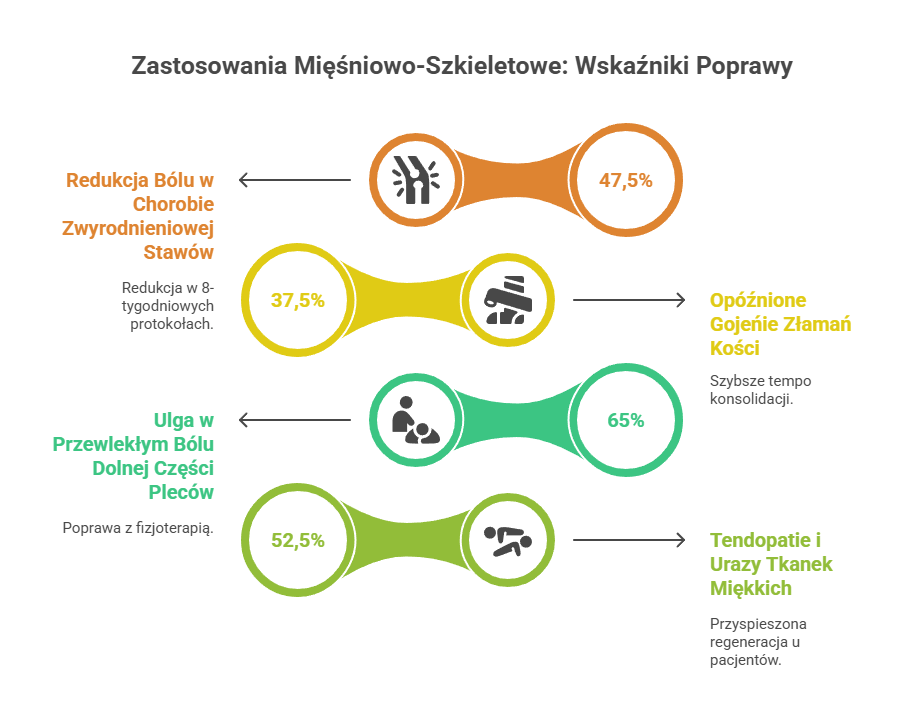 - Tendopatie i urazy tkanek miękkich pokazują przyspieszoną regenerację u 45-60% pacjentów